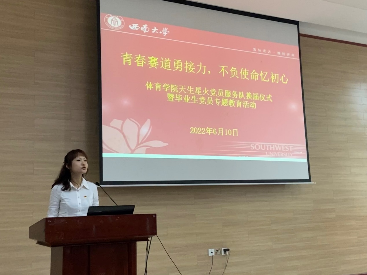 2022年6月10日下午15:30,西南大学体育学院天生星火党员服务队换届仪式暨毕业生党员专题教育活动在体育学院109报告厅举行。学院党委委员、党支部书记、全体学生党员和全体毕业生党员参与此次会议,学院党委副书记、纪委书记张剑兰担任主持人