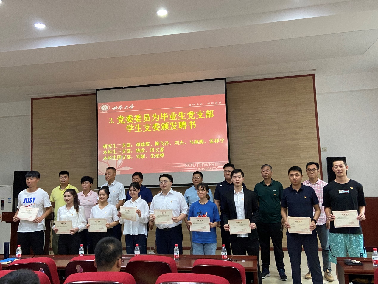 刘杰同志发言结束后,体育学院党委委员为毕业生党支部学生支委颁发聘书,并向全体毕业生党员赠送纪念奖牌。