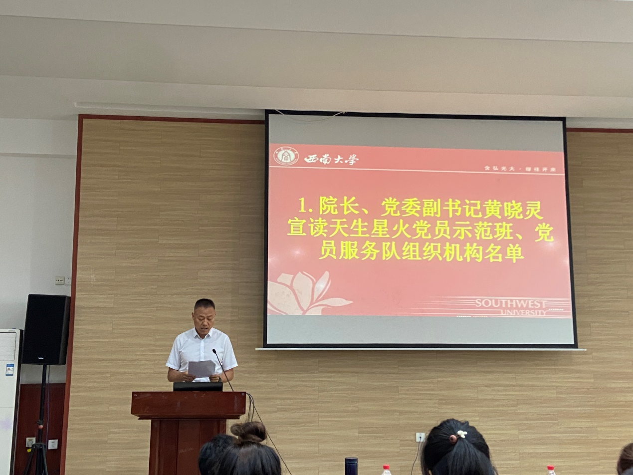 第一阶段,学院领导为天生星火党员服务队举行换届仪式。院长黄晓灵宣读天生星火党员示范班和服务队组织机构名单,党委书记郭立亚向天生星火党员示范班班长、服务队队长刘新授旗,刘新发表接旗感言。