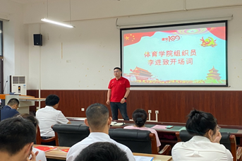 接下来,体育学院副院长刘峥表示,研究生一支部一直以来都在不断创新主题党日活动的形式,此次借中国共产党建党一百周年之际,开展讴歌党的光辉的红歌朗诵活动,能够让支部同志们在喜迎建党百年的同时,扎实推进“不忘初心、牢记使命”的教育。