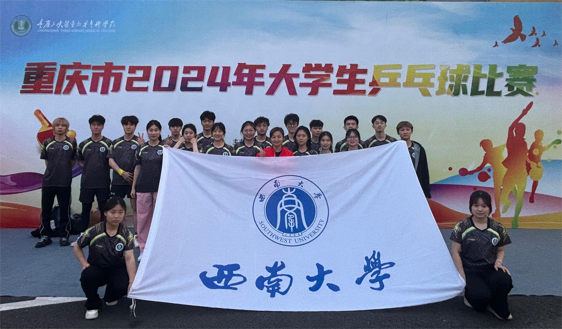 4月22日至26日,重庆市2024年大学生乒乓球比赛在重庆三峡医药高等专科学校举办。西大健儿表现抢眼,丙组运动员荣获男、女团体冠军,同时包揽男女单打、男女双打、混双项目的冠亚军。甲组运动员也取得了男子团体和混双项目两个第五名的好成绩。