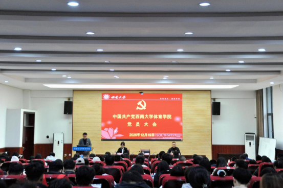 2025年12月19日下午,中共西南大学体育学院党员大会在学院109报告厅举行。这次大会是在国家制定“十五五”发展规划推动国民经济和社会高质量发展,建设教育强国、体育强国、健康中国走向深入,学校成功召开第四次党代会,学院高位推进建设西部领先、国内一流、国际知名的体育学院关键时期召开的一次重要会议。