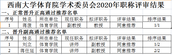 根据《西南大学关于开展2020年专业技术职务申报工作的通知》和《关于2020年专业技术职务学术评审阶段有关事宜的通知》要求,经个人申报、学校审查、学院学术委员会推荐评审等程序,现将体育学院学术委员会2020年职称评审结果公示如下: