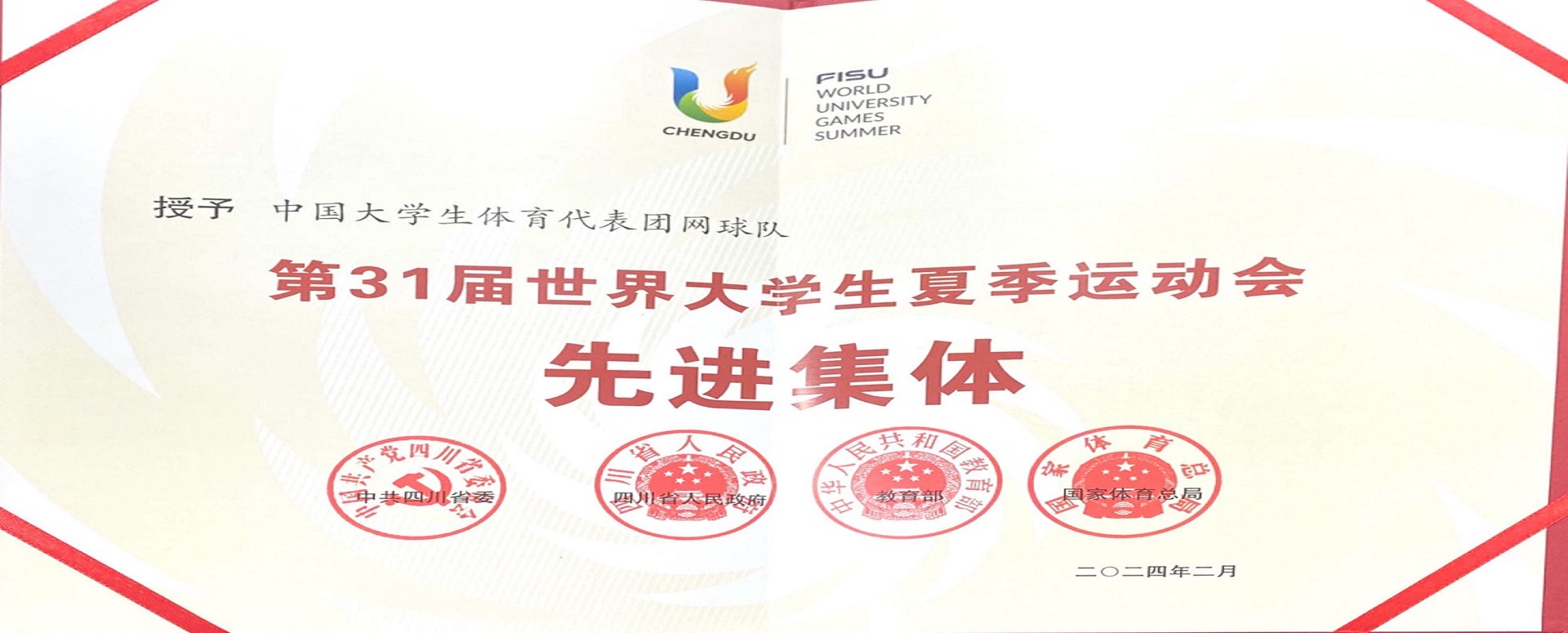 中国大学是体育代表团网球队(西南大学作为中国大学生体育协会网球分会主席单位和主要队员输送单位)荣获第31届成都大学生夏季运动会先进集体